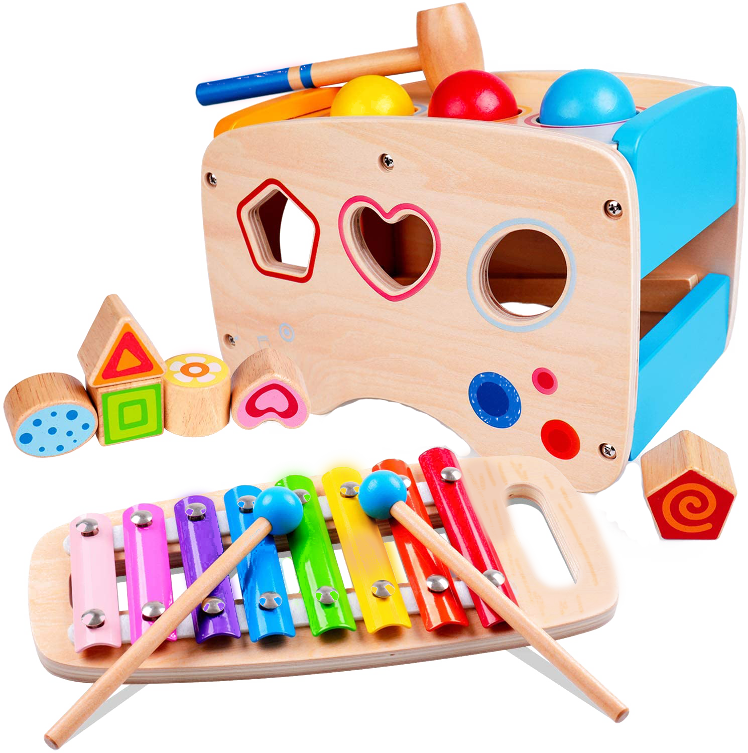 Fabricado con madera de caucho y bordes redondeados, no es necesario tener conocimientos musicales para practicar con este instrumento de la marca Rolimate. El último juguete de nuestra lista (indicado para niños a partir de un año) consta de un xilófono, 3 bolas, 1 martillo, 6 bloques de construcción, 1 oxófono y 2 palillos. Todo lo necesario para satisfacer las diferentes necesidades de juego e inspirar la inteligencia musical de los pequeños. Con sus bordes redondeados y sus colores llamativos este instrumento llamará la atención de los niños, que podrán experimentar creando sonidos o entretenerse con las diferentes formas y colores de las piezas de madera que incluye este juguete.