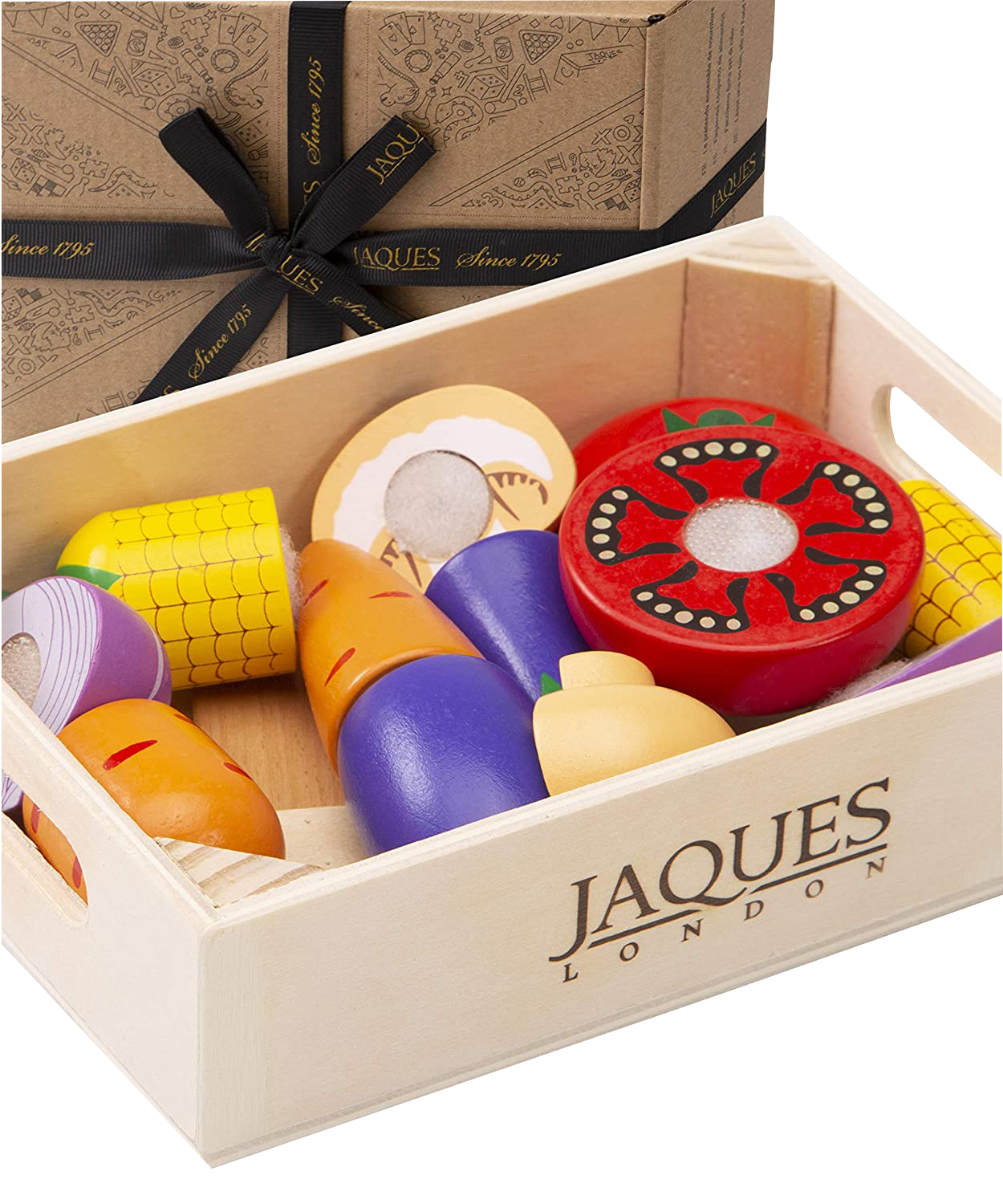Un bonito set formado por todo tipo de alimentos de madera con el que los más pequeños podrán imaginar todo tipo de historias mientras practican combinando alimentos. Una gran adición a cualquier cocinita de juguete que también puede usarse por separado como una forma de potenciar la imaginación y mejorando las habilidades motoras de los niños mientras juegan a cortar los diferentes alimentos del set con el cuchillo de madera incluido.