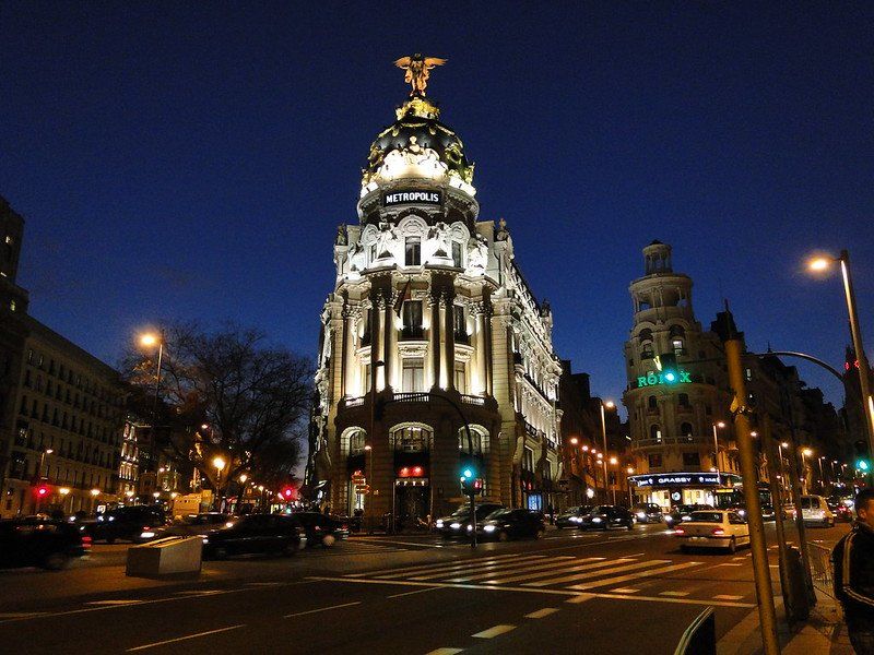 Continuamos el tour en el impresionante edificio Metrópolis de inspiración francesa, situado en la esquina de la calle Alcalá. Este edificio es uno de los más representativos de la ciudad de Madrid, su cúpula de pizarra con símbolos dorados y coronada por una estatua alada te dejarán impresionado.