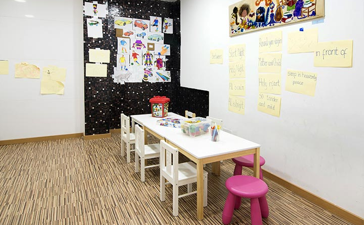 También tienen un Aula-Taller llena de materiales plásticos, donde imparten diferentes talleres creativos para después del cole y El Aula-Telón con su gran escenario donde llevan a cabo espectáculos,