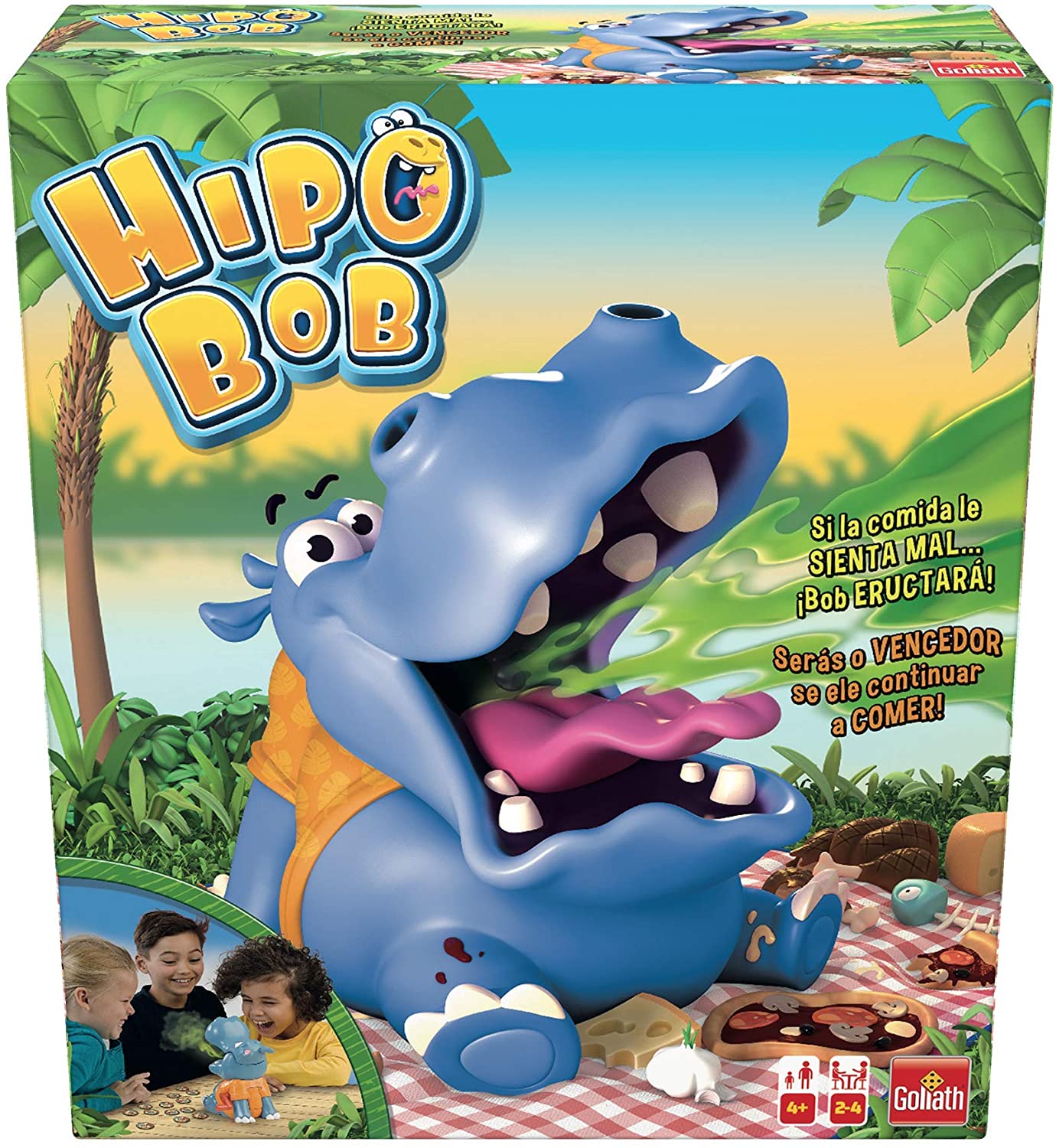 Hipo Bob, un hipopótamo muy glotón que lo único que quiere es comer: su pasatiempo favorito. Hay un problema, si come mucho y la comida le sienta mal eructará. Debes elegir bien la ficha adecuada de comida porque si no el pobre hipopótamo no se encontrará bien. Un muñeco glotón y divertido que forma parte de un juego de 2 a 4 jugadores y que es perfecto para niños a partir de 12 años.