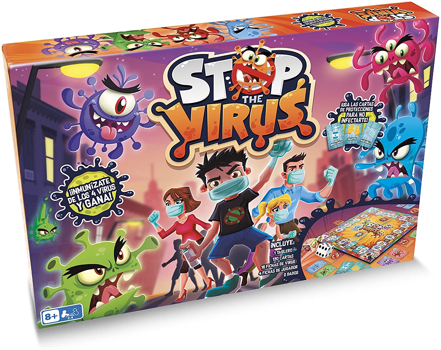 aprender a combatir los virus que pueden contagiar, para ello dispones de las mejores herramientas: guantes, mascarillas, geles y super medicinas. El objetivo del juego es conseguir humanizarte de los 4 virus. Tu deber será protegerte adecuadamente e ir avanzando en el tablero mientras entorpeces el avance de tus contrincantes. Por descontado, creará un ambiente divertido y comunicativo con los más pequeños que ayudará a la desdramatización y al desarrollo de un aprendizaje sobre la pandemia actual que ha tocado vivir.