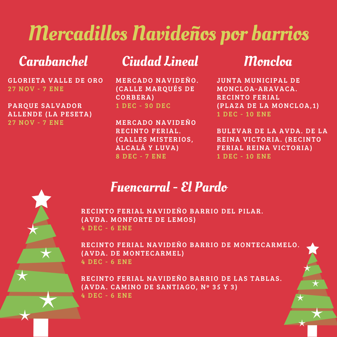 También los distritos de Carabanchel, Ciudad Lineal, Fuencarral-El Pardo y Moncloa-Aravaca ofrecen mercadillos más tradicionales en sus recintos feriales y plazas más relevantes a partir del 4 de diciembre. Descubre todos los detalles a continuación: