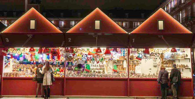 El principal se encuentra en la Plaza Mayor, donde los madrileños podrán recorrer 104 casetas, 50% menos que el año pasado, hasta el 31 de diciembre. Como novedad este año las casetas convivirán con las terrazas.