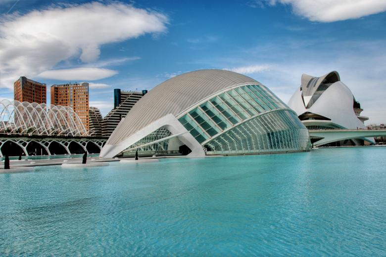 Este complejo arquitectónico futurista es la portada de todas las guías de viaje de la ciudad. La Ciudad de las artes y las ciencias, diseñada por Santiago Calatrava y Félix Candela, está situada al final del viejo cauce del río junto al Jardín del Turia. Actualmente, el complejo está formado por siete espacios: L’hemisfèric, el Museo de las ciencias del Príncipe Felipe, el Umbracle, el Oceanogràfic, el Palacio de las artes Reina Sofía, el Puente de l'Assut de l'Or y el Àgora. Tanto si vas a pasear entre los impresionantes edificios, como si decides disfrutar de las salas de exposiciones o de una proyección en IMAX en una pantalla cóncava de 900 metros en el Hemisféric, la Ciudad de las artes y las ciencias es una visita obligatoria.