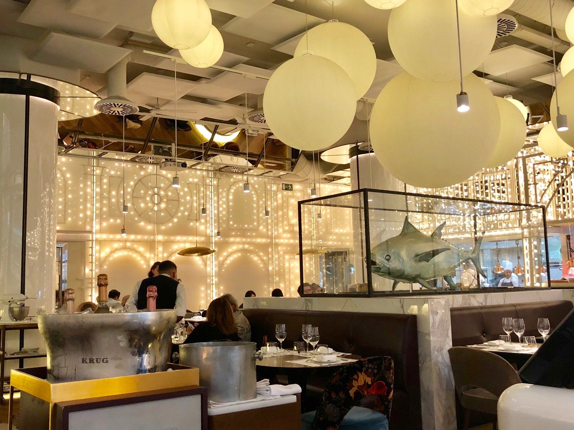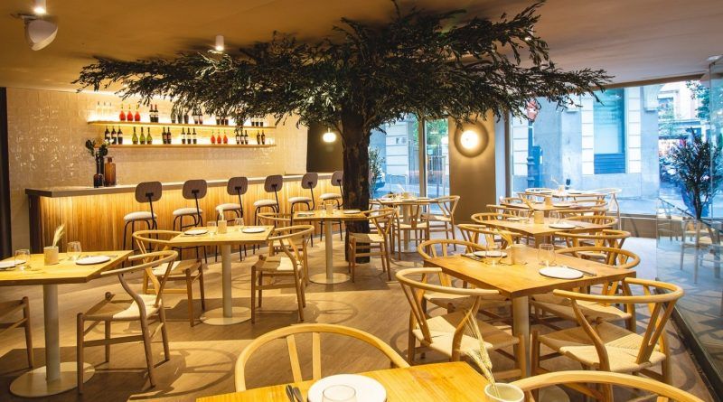 BiBo Madrid refleja la esencia de la cocina viajera de BiBo a través del gran globo aerostático que pende sobre la barra y el concepto de una Andalucía cosmopolita y elegante.