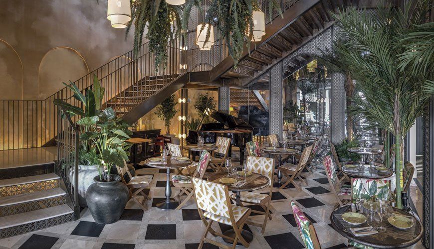 El resultado es un espectacular espacio que gira en torno a un patio inspirado en la arquitectura colonial cubana. En este patio de 8 metros de altura se reinterpretan las antiguas fachadas de La Habana mediante una malla metálica perforada, una iluminación cálida y una vegetación que recrean el ambiente tropical y el optimismo de la capital cubana.