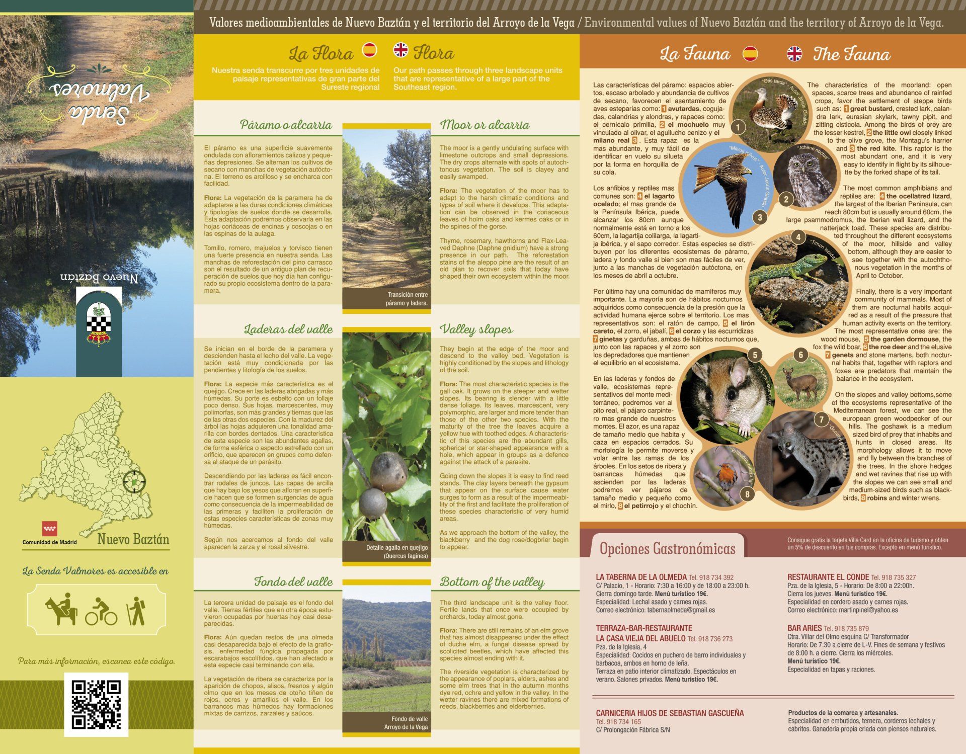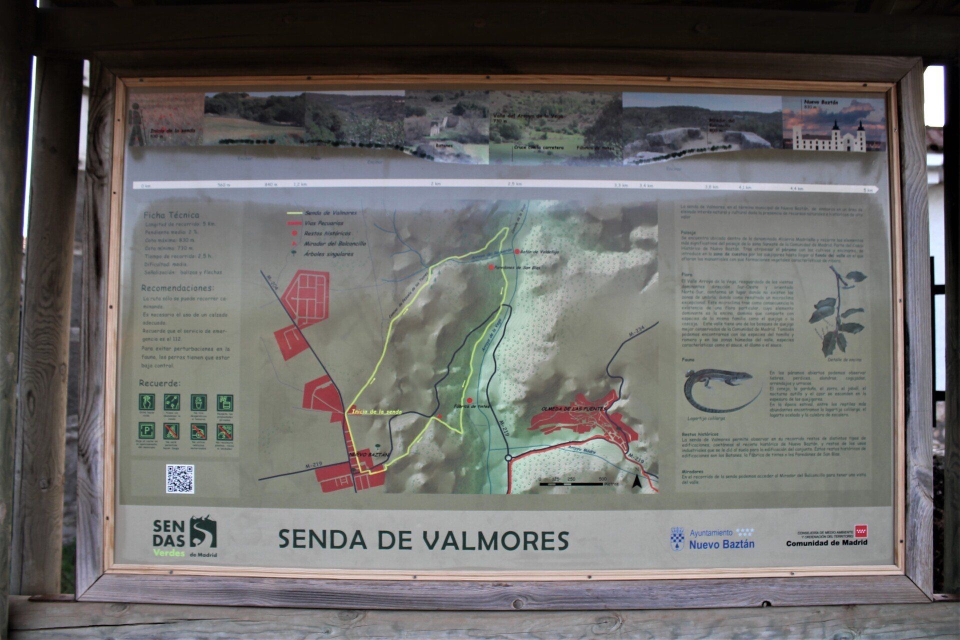 Una ruta circular de 5,6 kilómetros que forma parte de la red de Sendas de la Comunidad de Madrid. La Senda Valmores comienza en la intersección de los caminos que cruzan la M-204, poco antes de llegar a Nuevo Baztán. Además, esa intersección coincide con el inicio del camino del Boleo que conduce hasta el cementerio de la localidad. Desde ese punto, da comiendo un largo camino contemplando una pista forestal, mientras se atraviesa el páramo rodeado de cultivos, fincas privadas y encinas. Tras terminar esta primera fase, tiene lugar una cuesta que conduce hasta el fondo del valle.